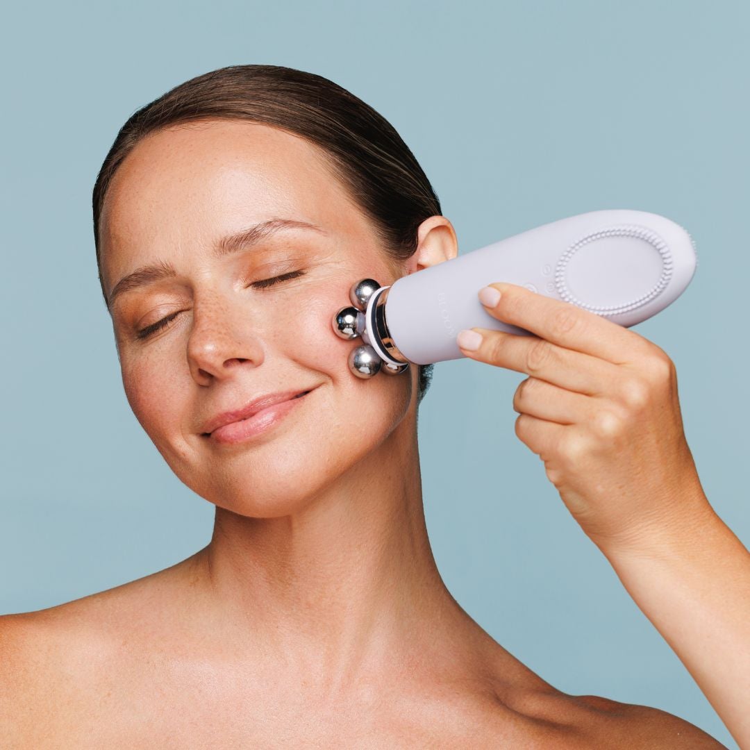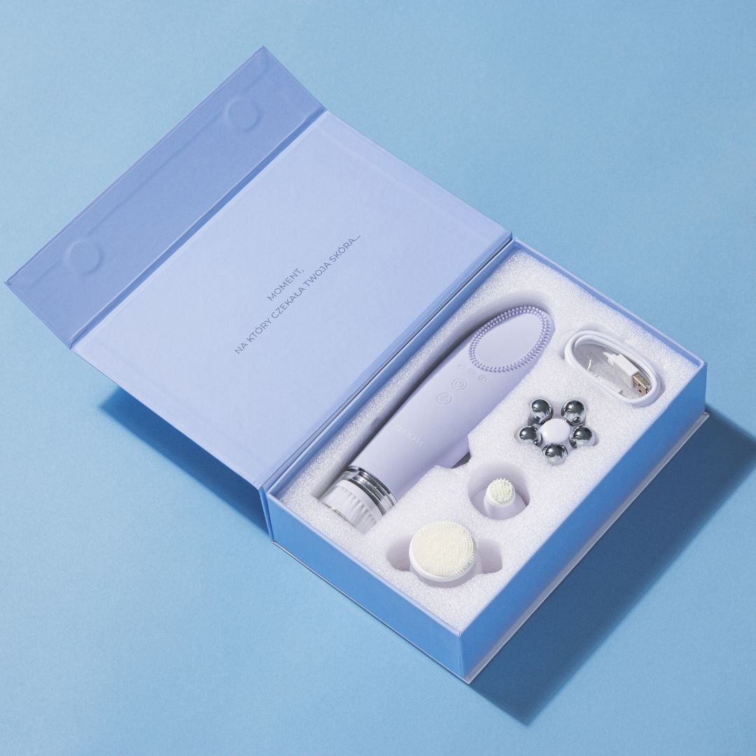 Przygotowanie skóry: Rozpocznij od użycia głowicy oczyszczającej na twarz, szyję i dekolt. Dzięki temperaturze do 56°C i 8000 wibracjom na minutę, duża głowica delikatnie zmiękcza zanieczyszczenia i usuwa nadmiar sebum oraz resztki makijażu. Dla mniej dostępnych partii twarzy zastosuj średnią głowicę, lub małą dedykowanę strefie „T” (nos, broda, czoło)